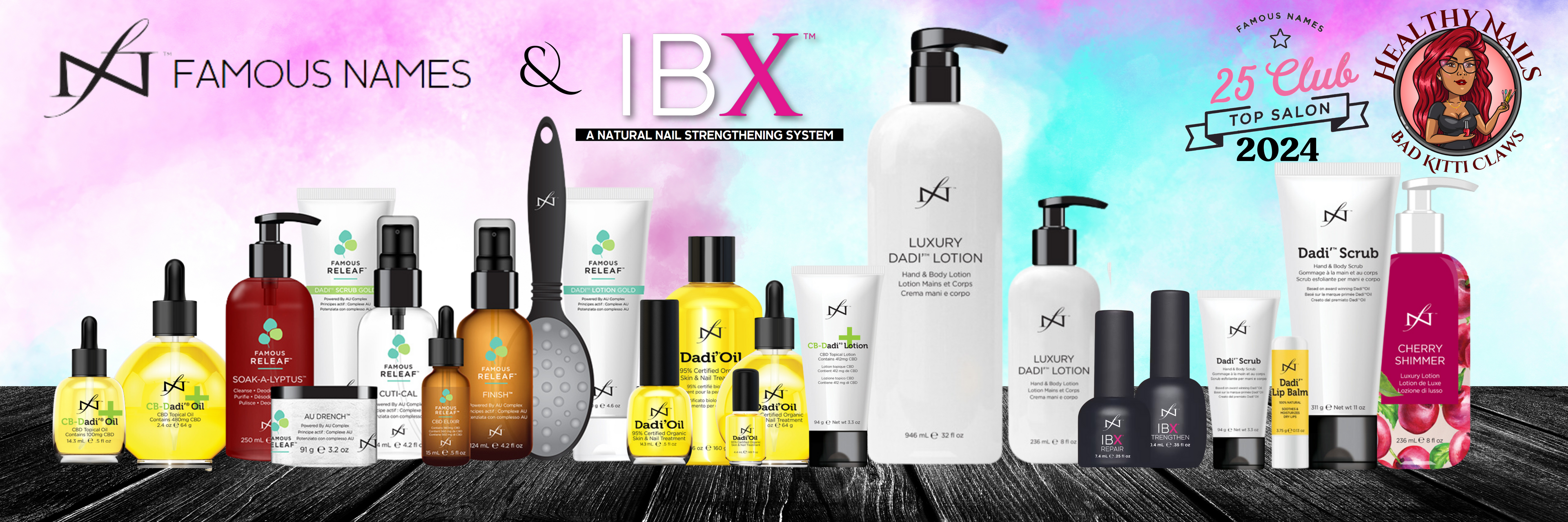 We are proud to bring the award-winning Famous Names Product Line to our Healthy Nails Salon! From the incredible Dadi' Oil Skin & Nail Treatment to the one-of-a-kind IBX Nail Strengthening System, this product line gives you natural and organic products that leave your skin and nails healthier than ever.