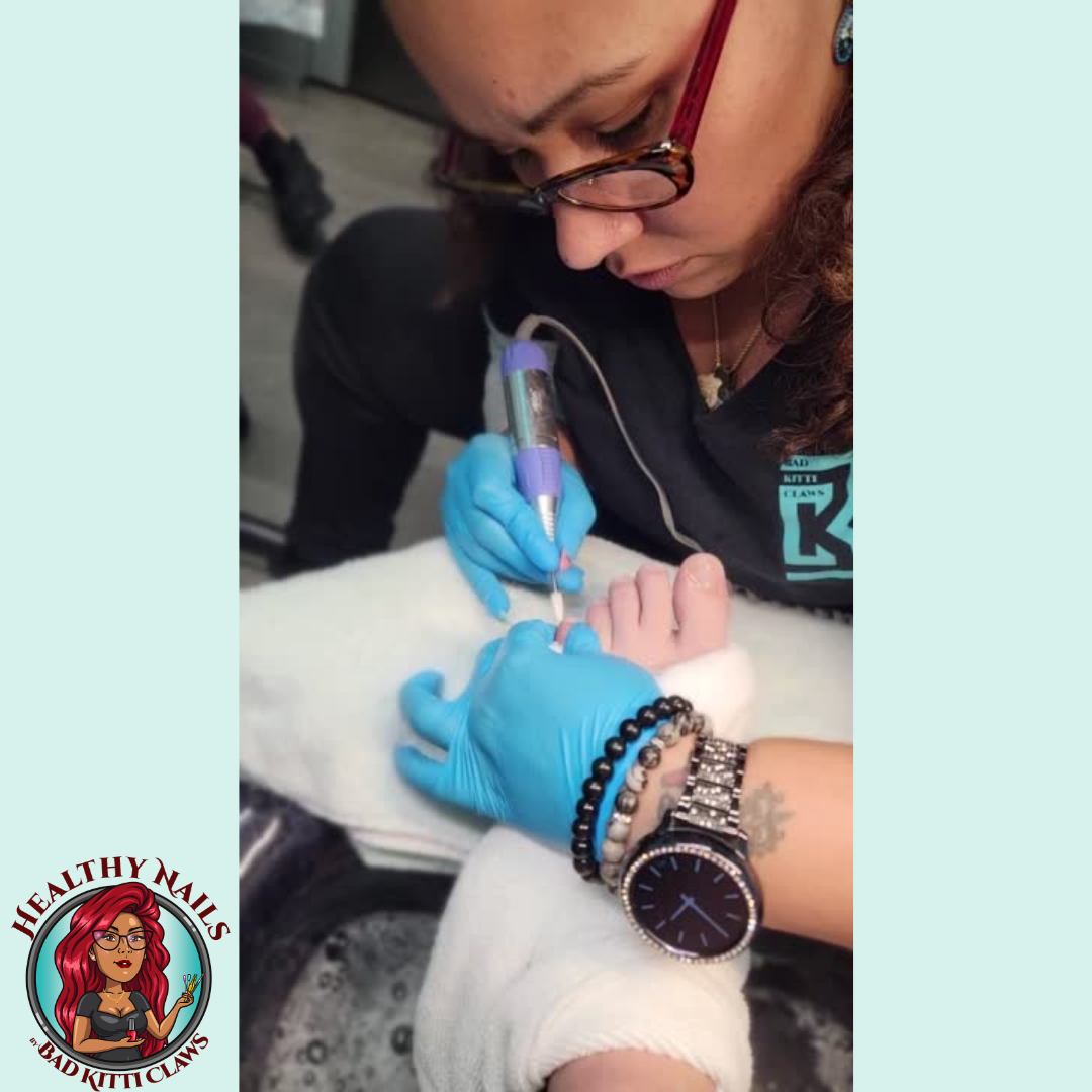 We remove existing gel polish or gel enhancements from the hands or feet using an e-file.